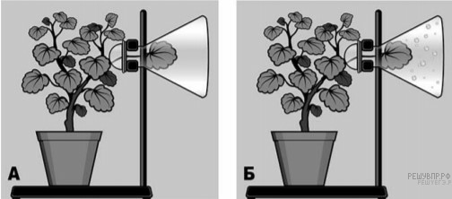 Известно, что вода играет важнейшую роль в жизни растений. Сергей решил проверить одно из значений воды, проведя следующий опыт. Он взял растение в горшке, поставил его на штатив, к которому прикрепил колбу, поместив в неё лист растения. Горлышко колбы он прикрыл ватой (рис. А). Штатив с растением Сергей поставил на подоконник и через несколько дней наблюдал следующую картину (рис. Б).
