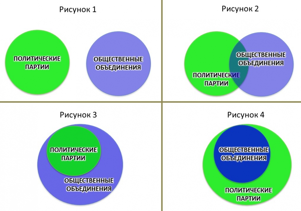 На каком из рисунков с помощью кругов Эйлера наиболее точно отражено соотношение понятий "политическая партия" и "общественное объединение"?