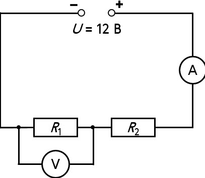 Определите показания приборов в цепи, схема которой представлена на рисунке. Сопротивления резисторов R1 = 20 Ом, R2 = 40 Ом. Ответ запишите без единиц измерения через пробел в порядке: сила тока, напряжение. Например, 1 2