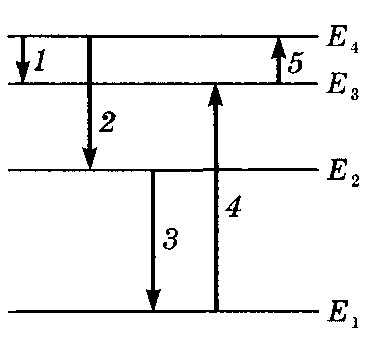На рисунке изображена схема энергетических уровней атома. Какой цифрой обозначен переход с одного энергетического уровня на другой электрона, излучающего фотоны с минимальной энергией?