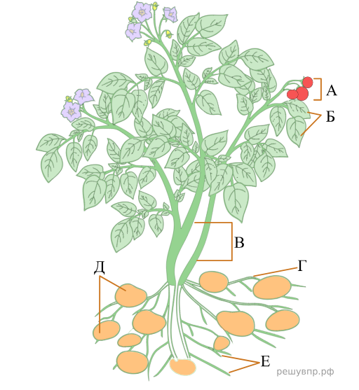 Установите соответствие между органами растения, обозначенными буквами А–Е на рисунке, и их названиями