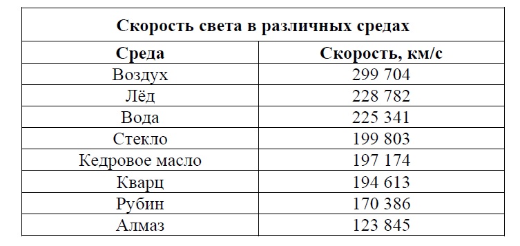 Известно, что солнечные лучи достигают Земли за 8 минут 20 секунд. Скорость света в вакууме 299 792 км/с. Пользуясь таблицей, определите, в каких средах свет пройдёт то же самое расстояние более чем за 16 минут? Ответ кратко поясните.
