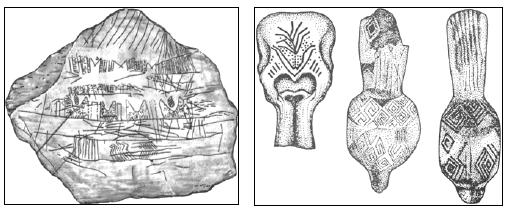 На якому етапі розвитку первісного суспільства на українських землях уперше з'являються наскельні малюнки, різьблені орнаменти на виробах, прикраси?