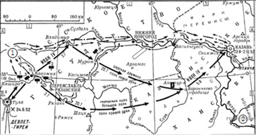 Укажите название обозначенной цифрой 2 земли, где в период данного похода существовало кочевое государство, образовавшееся в результате распада Золотой Орды, фактически с 1557 г. добровольно вошедшего в сферу политического и экономического влияния Русского централизованного государства.