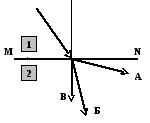 В каком направлении будет распространяться световой луч после прохождения через границу раздела сред MN, если оптическая плотность первой среды больше, чем второй (смотри рисунок)?