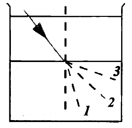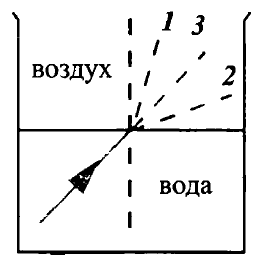 Луч света переходит из воды в воздух. Пунктирными линиями на рисунке намечены три направления: 1, 2 и 3. Какое из них может приблизительно соответствовать преломленному в этом случае лучу?