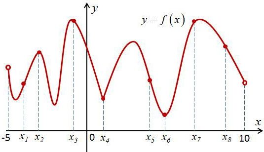 Функция у = f(x) определена на интервале (–5; 10). На рисунке изображен график функции у = f(x). Найдите среди точек х1, х2, ..., х8 те точки, в который производная функции f(x) равна нулю. В ответ запишите количество найденных точек.