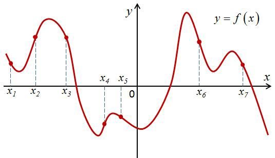 На рисунке изображен график функции у = f(x). Найдите среди точек х1, х2, ..., х7 те точки, в который производная функции f(x) отрицательна. В ответ запишите количество найденных точек.