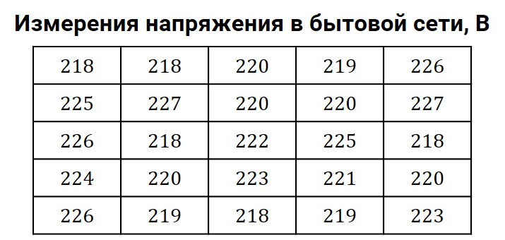 Дана таблица, в которой приведены результаты 25 измерений напряжения в бытовой сети. Чему равен размах?
