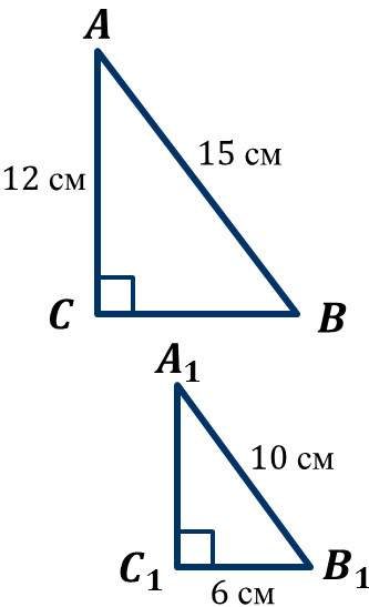 Являются ли прямоугольные треугольники АВС и А1В1С1 подобными, если стороны АВ и АС треугольника АВС соответственно равны 15 см и 12 см, а стороны А1В1 и В1С1 треугольника А1В1С1 соответственно равны 10 см и 6 см?