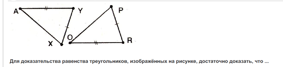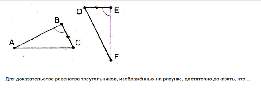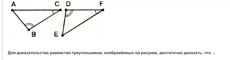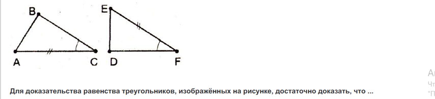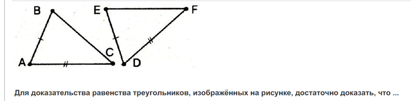 В треугольнике АВС все стороны равны. В треугольнике DEF все стороны равны. Чтобы доказать равенство этих треугольников, достаточно доказать ...