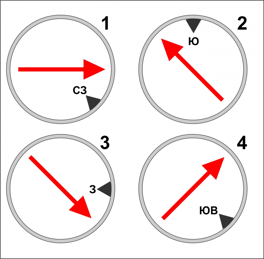 Определите направление стрелки (это не стрелка компаса указывающая на север, а направление стороны горизонтка в каждом случае при таком положении компаса)