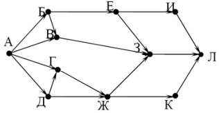 На рисунке – схема дорог, связывающих города А, Б, В, Г, Д, Е, Ж, З, И, К и Л. По каждой дороге можно двигаться только в одном направлении, указанном стрелкой. Сколько существует различных путей из города А в город Л, не проходящих через К?