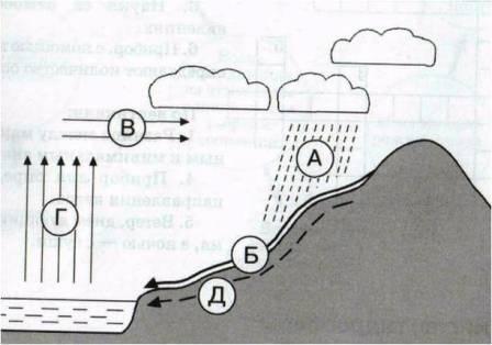 Какими буквами на схеме круговорота воды отмечены ...?