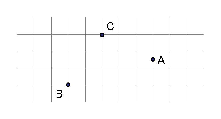 На клетчатой бумаге с размером клетки 1 см x 1 см отмечены точки А, В и С. Найдите расстояние от точки А до середины отрезка ВС. Ответ выразите в сантиметрах.