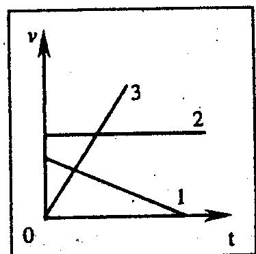 Даны графики зависимости скорости от времени для прямолинейно движущихся тел 1, 2 и 3. В каком из этих случаев равнодействующая всех приложенных к телу сил равна нулю?
