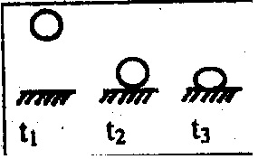 На рисунке изображен падающий на землю мяч в разные моменты времени: во время движения к земле (t1), перед соприкосновением с землей (t2) и в момент наибольшей деформации (t3). Как менялась кинетическая энергия мяча от t1 до t2 и от t2 до t3?
