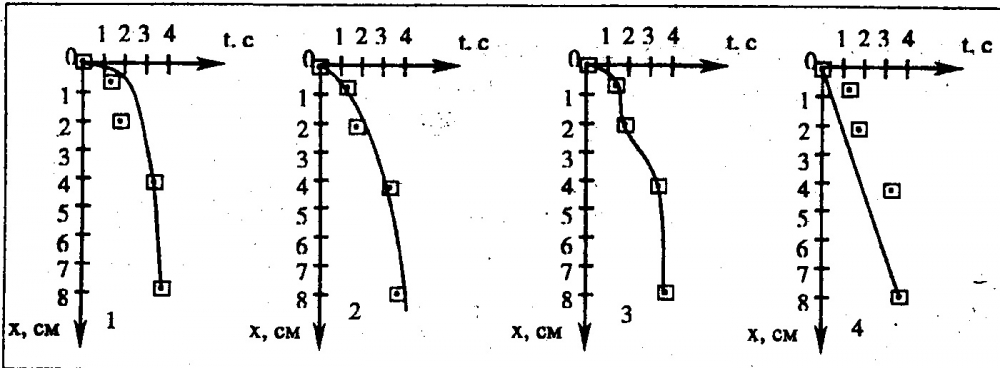Шарик погружался на дно сосуда, заполненного вязкой жидкостью. Координаты шарика относительно поверхности жидкости измерялись через каждую секунду и отмечались точками на четырех рисунках. Квадратами вокруг точек показана область погрешности измерений координаты и времени. На каком из рисунков график проведен правильно (с учетом всех результатов измерений)?