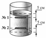 Пластинка №1 находится на глубине 5 см от поверхности воды, а пластинка №2 на расстоянии 5 см от дна сосуда. На какую из них давление воды больше?