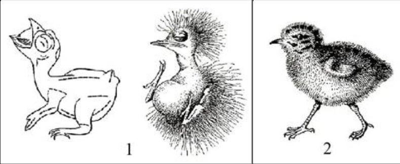 Установите соответствие между характеристиками птиц и типами развития птенцов, обозначенных на рисунке цифрами 1, 2. Запишите цифры 1 и 2 в порядке, соответствующем буквам.