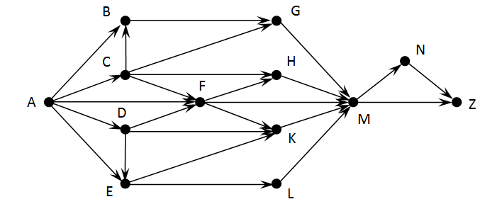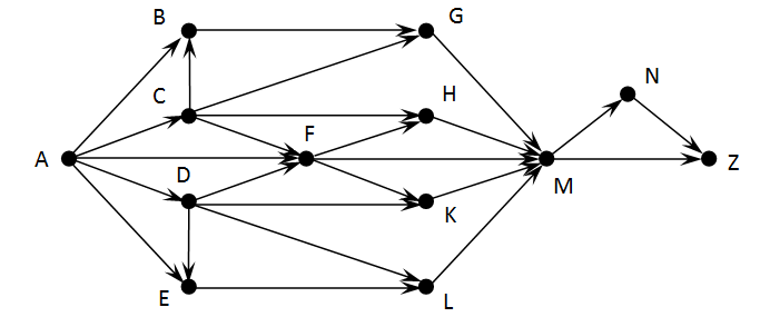 На рисунке – схема дорог, связывающих города A, B, C, D, E, F, G, H, K, L, M, N, Z. По каждой дороге можно двигаться только в одном направлении, указанном стрелкой. Сколько существует различных путей из города А в город Z?