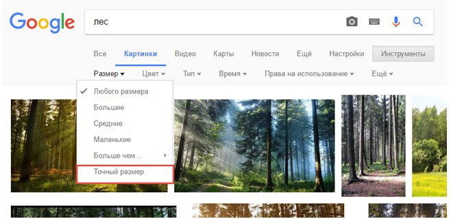 Какие параметры в поисковой системе Google можно задавать для картинки при выборе пункта "Точный размер"?