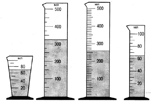 На рисунке представлены четыре мензурки с разными жидкостями равной массы. В какой из мензурок находится жидкость с наибольшей плотностью?