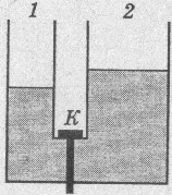Два сосуда, 1 и 2, заполнены одинаковой жидкостью. Кран К закрыт. Будет ли переливаться жидкость из одного сосуда в другой, если открыть кран?