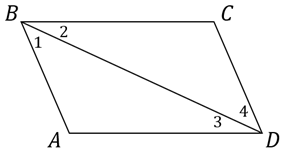 На рисунке: угол 1 равен углу 4, а угол 2 равен углу 3. Будут ли равны треугольники ABD и CDB?