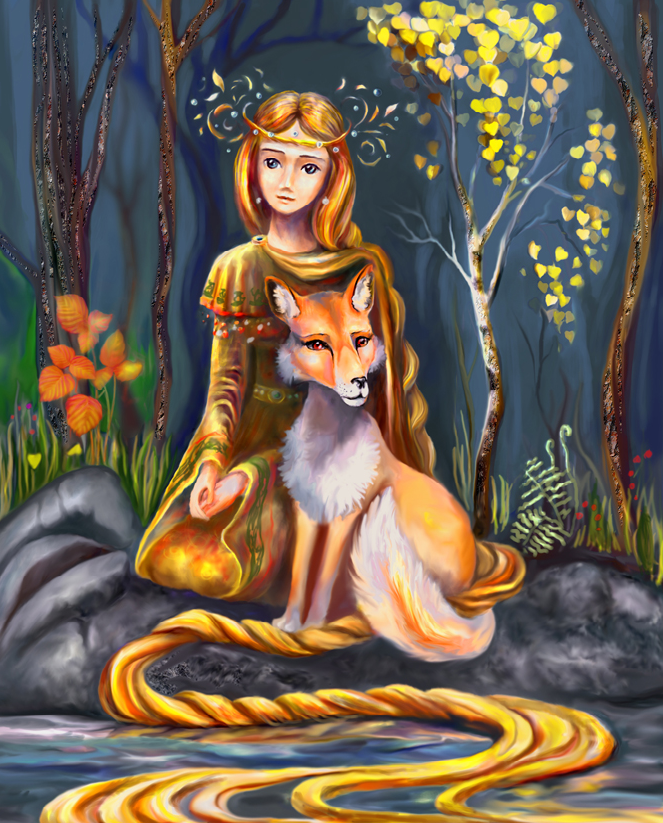 "Эта девица - Полозова дочь, прозывается Золотой Волос. Волосы у нее из чистого золота. Ими она к месту и прикована. Сидит да косу полощет, а весу не убывает. Попытай вот, подыми ее косыньку - узнаешь, впору ли тебе ее снести".