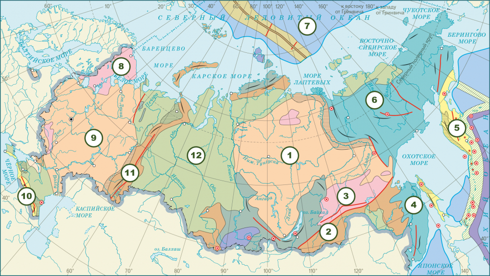 Какими цифрами на карте обозначены тектонические структуры на территории России?