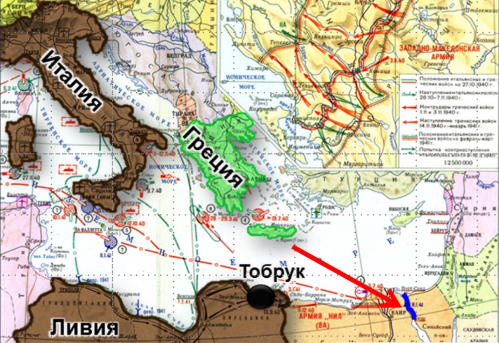 Как называется объект, отмеченный на карте линией синего цвета (на него указывает красная стрелка)? Этот объект был важен и для союзников, и для германо-итальянских войск.