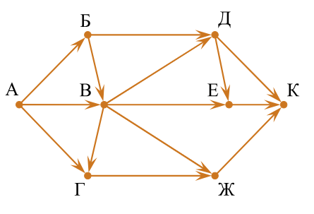 На рисунке — схема дорог, связывающих города А, Б, В, Г, Д, Е, Ж, К. По каждой дороге можно двигаться только в одном направлении, указанном стрелкой. Сколько существует различных путей из города А в город К, проходящих через город В?