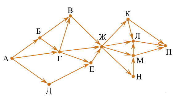 На рисунке — схема дорог, связывающих города А, Б, В, Г, Д, Е, Ж, К, Л, М, Н, П. По каждой дороге можно двигаться только в одном направлении, указанном стрелкой. Сколько существует различных путей из города А в город П, проходящих через город Е?
