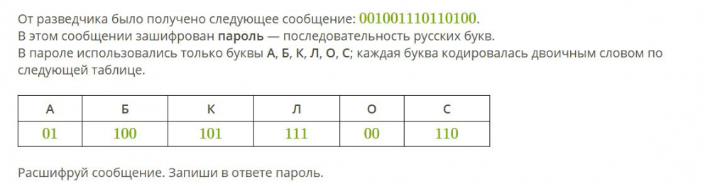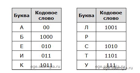По каналу связи передаются шифрованные сообщения, содержащие только десять букв: А, Б, Е, И, К, Л, Р, С, Т, У; для передачи используется неравномерный двоичный код. Для девяти букв используются кодовые слова.