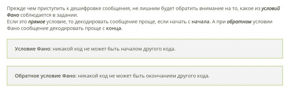 Примечание. Условие Фано означает, что никакое кодовое слово не является началом другого кодового слова. Это обеспечивает возможность однозначной расшифровки закодированных сообщений.