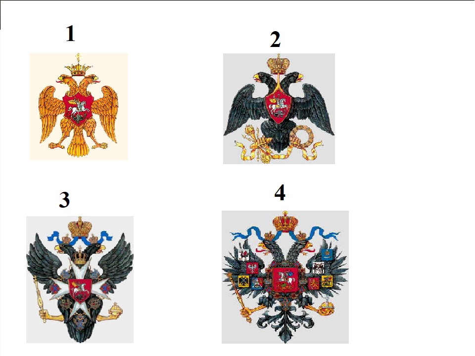 Найдите на иллюстрации герб Российской империи начала XX века. Выберите среди вариантов правильный ответ