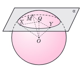 Пусть сфера с центром O пересечена плоскостью α, и Q — основание перпендикуляра, опущенного из центра O на плоскость α.Пусть X и Y — произвольные точки линии пересечения сферы с плоскостью α.