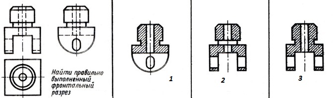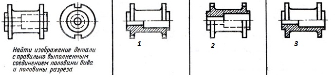 выбрать чертеж, на котором правильно выполнено соединение половины вида и половины разреза цилиндрических деталей, изображенных без разреза