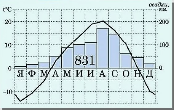 Дайте описание климатограммы по плану: ср января, июля, амплитуда, осадков за год. Ответ запишите через запятую, без единиц измерения.
