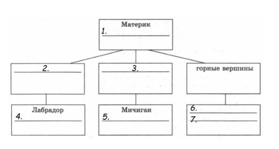 В приведённом ниже списке перечислены крупные географические объекты. Выберете из представленного ниже списка названия географических объектов, расположенных на территории изучаемого материка, и заполните схему. Впишите в схему название материка, типы и названия выбранных вами географических объектов с большой буквы (например: 1- Евразия, 2-......, 3-...... и т.д.).