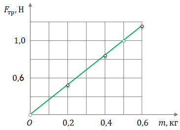 При исследовании зависимости модуля силы трения скольжения деревянного бруска по поверхности стола от массы бруска на брусок помещали дополнительные грузы. По результатам исследования получен график, представленный на рисунке. Приняв g = 10 м/с2, определите коэффициент трения. В ответ запишите только число (например, 5,2).