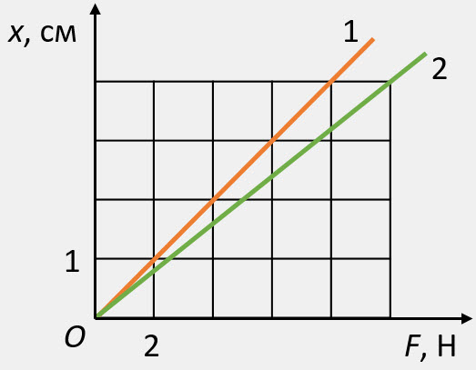 На рисунке приведены графики зависимости абсолютного удлинения двух пружин от приложенных к ним сил. Жесткости пружин, состоящие из последовательно и параллельно соединенных пружин 1 и 2, равны: