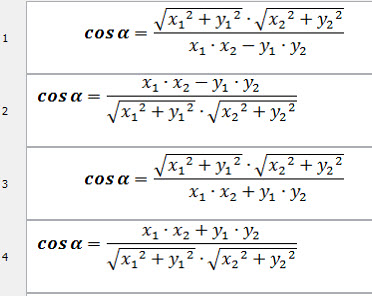 Укажите формулу вычисления косинуса угла между векторами по их координатам