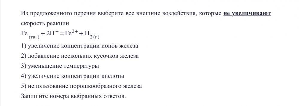 Из предложенного перечня выберите все внешние воздействия, которые приводят к увеличению скорости реакции железа с серой.