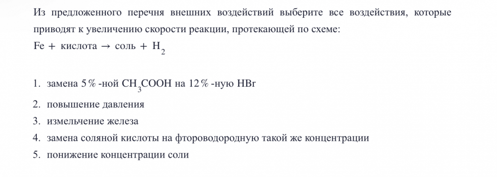 Из предложенного перечня выберите все внешние воздействия, от которых зависит скорость химической реакции между железом и уксусной кислотой.
