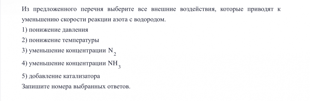 Из предложенного перечня выберите все внешние воздействия, которые приводят к уменьшению скорости реакции азота с водородом.