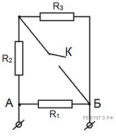 начальный момент времени ключ К замкнут, сопротивления всех резисторов равны R1 = R2 = R3 = R = 6 Ом. На сколько увеличится сопротивление на участке АБ, если ключ К разомкнуть?