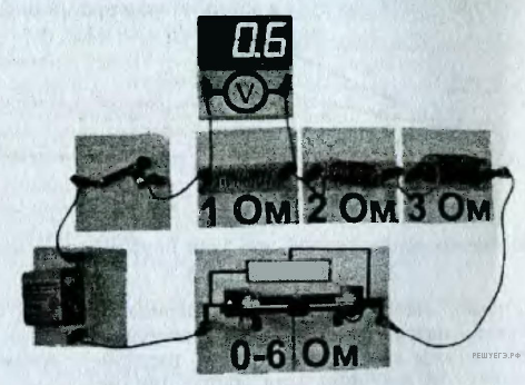 На фотографии — электрическая цепь. Показания вольтметра даны в вольтах. Чему будут равны показания вольтметра, если его подключить параллельно резистору 2 Ом? (Ответ дайте в вольтах. Вольтметр считать идеальным.)
