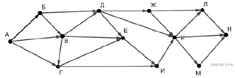 На рисунке — схема дорог, связывающих пункты А, Б, В, Г, Д, Е, Ж, И, К, Л, М, Н.